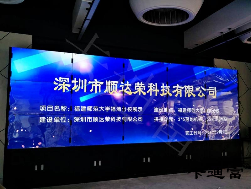 根据福建福清分校的使用需求,用户对多家产品进行比较及筛选,给出了多种188bet金宝搏亚洲下载最佳选择 解决方案,在众多拼接屏厂家经过投标,顺达荣科技竞标成功,最终选择了卡迪富的提供的55寸大屏幕188bet金宝搏亚洲下载最佳选择 解决方案。此拼接屏以屏体超薄设计,落地机柜装饰,55寸3x5超窄边大屏幕拼接屏,采用三星工业级专用面板,拼缝低至3.5 mm,屏幕分辨率高达1920*1080,4000:1高对比度,支持24小时不间断开机运行对于信号采用的是数字高清解码矩阵,可实现在单屏上均匀显示不同的画面,可对不同的信号进行转换,可实现画面叠加、漫游等效果,满足用学校拼接墙来展示、开会、文演等已经足够。