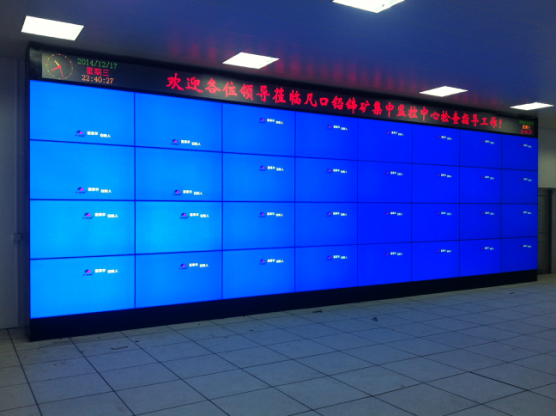 32块凡口铅锌矿集中监控中心液晶拼接系统案例 用台1分16的VGA分配器将视频播放器的画面显示到,3*3的49寸5...