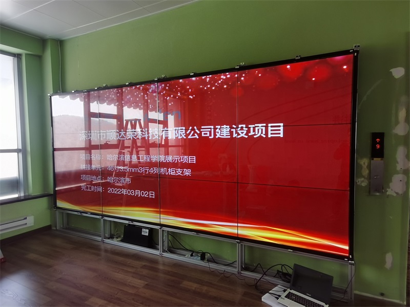 哈尔滨信息工程学院采用卡迪富46寸拼接屏3.5mm 3行4列机柜支架安装方案,9块大屏拼接,呈现效果得到了学院全...
