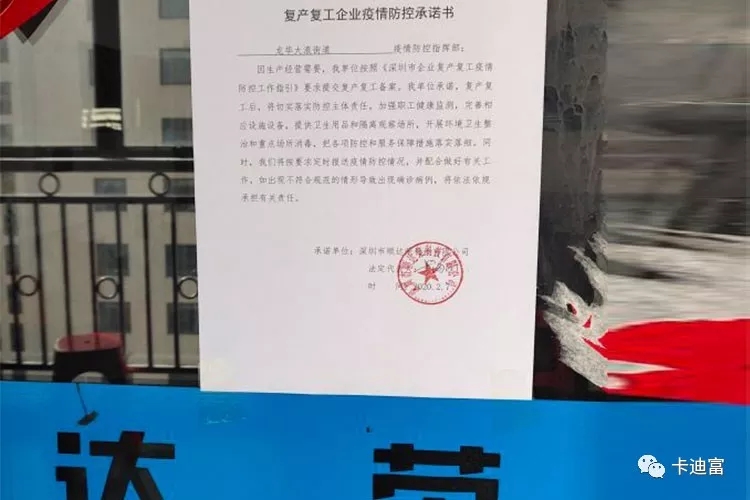 为科学有序推动企业尽快复工复产,我街道复工由“企业报备、政府审核”调整为“企业承诺,政府监管”,顺达荣会自行做好防疫准备,从严落实“四个到位”“八个必须”“八个严禁”,达到各项复工标准条件,我们将复产复工企业疫情防控承诺书张贴到了公司门口,欢迎领导后续上门检查和指导。
