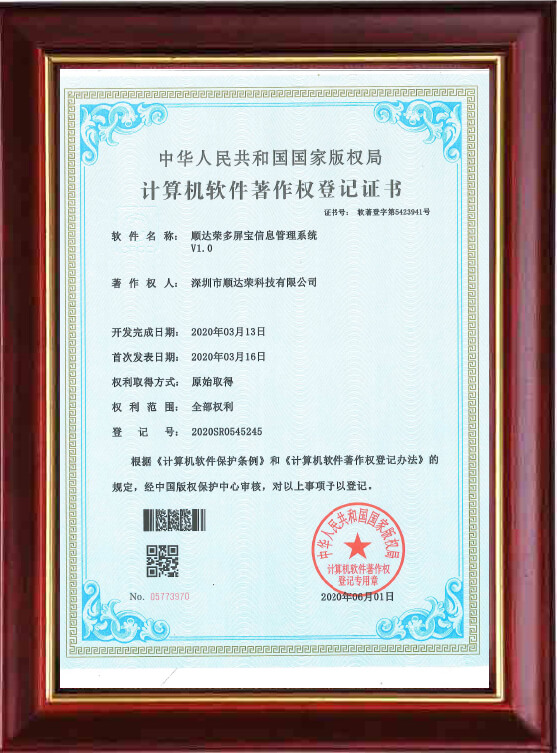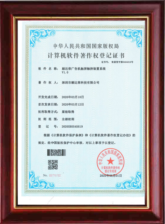 顺达荣广告机触摸屏触控装置系统软件著作权登记证书。