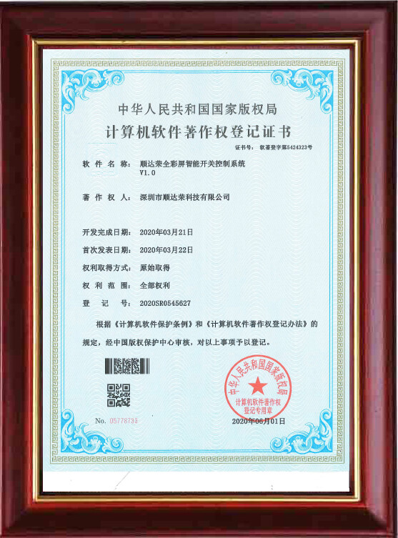 计算机软件著作权登记证书:顺达荣全彩屏智能开关控制系统