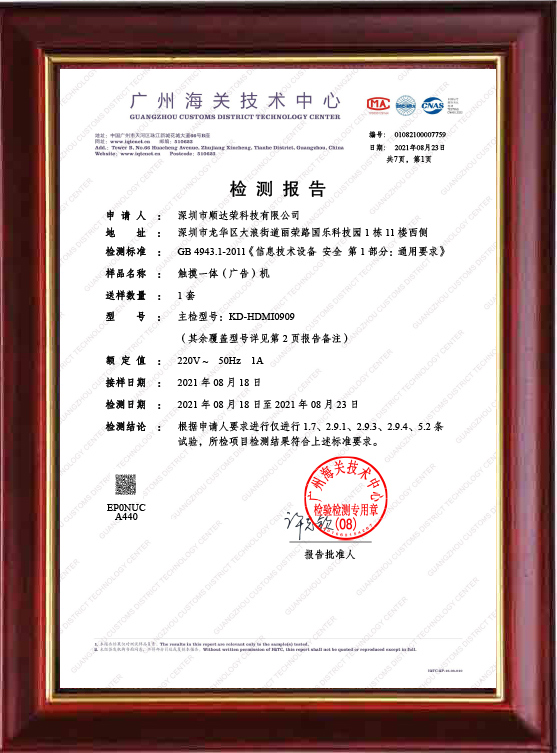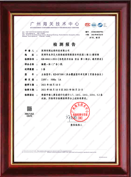 卡迪富KAWDEN触摸一体(广告)机KD-B7500检测报告证书。