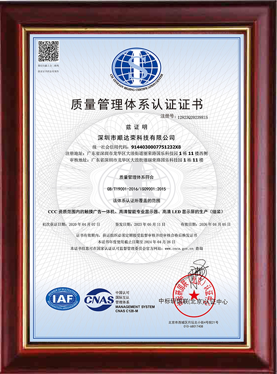 188bet手机版客户端 产品ISO9001质量管理体系认证证书,认证覆盖范围:CCC资质范围内的触摸广告一体机...