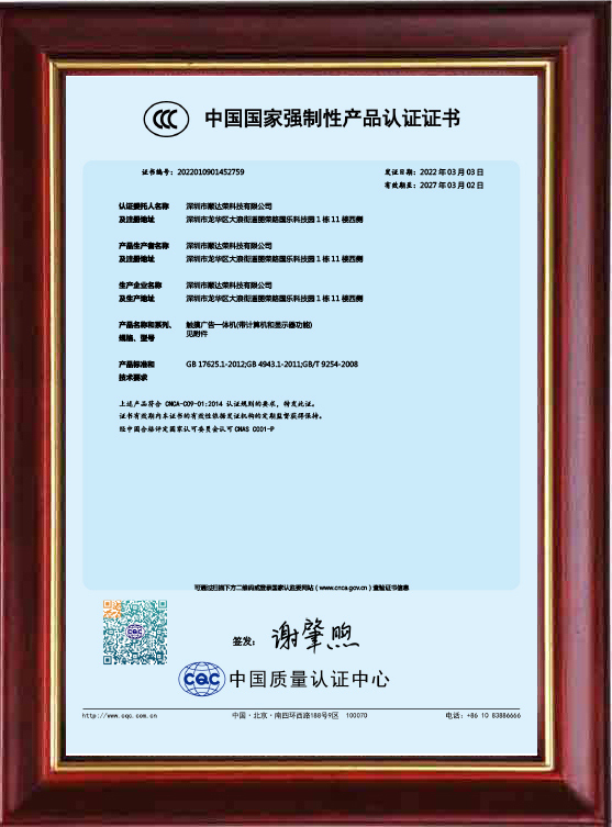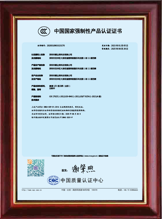 拼接屏厂家-深圳顺达荣科技 188bet金宝搏亚洲下载最佳选择 3C产品认证证书,中国国家强制性产品认证证书。