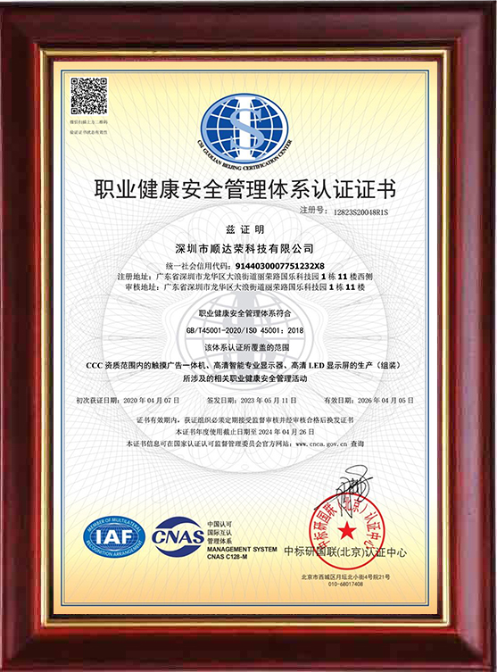 ISO45001职业健康管理体系认证证书,证明188bet手机版客户端 触摸广告一体机、高清智能专业液晶显示屏...