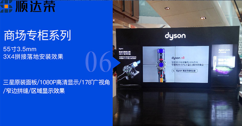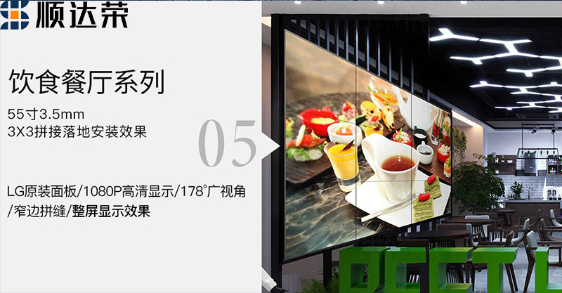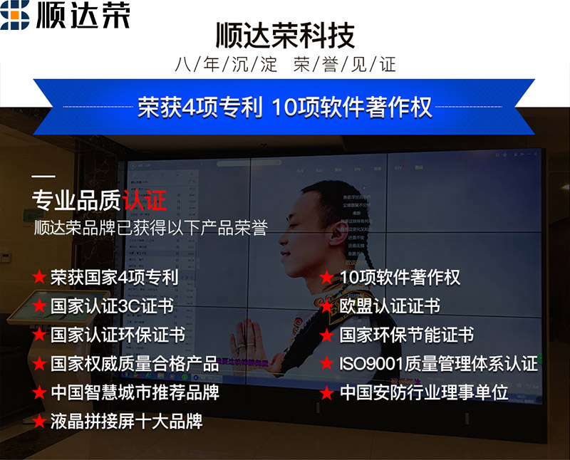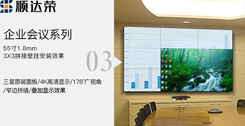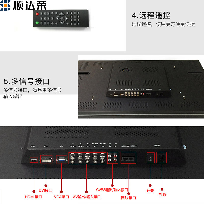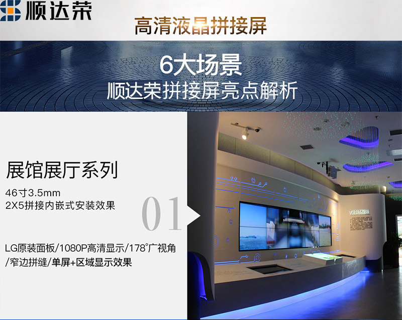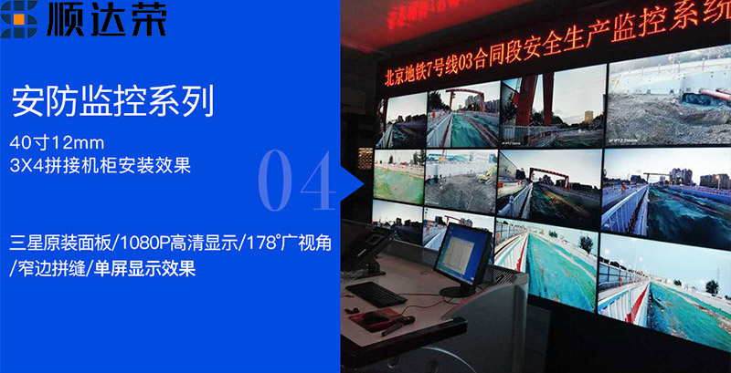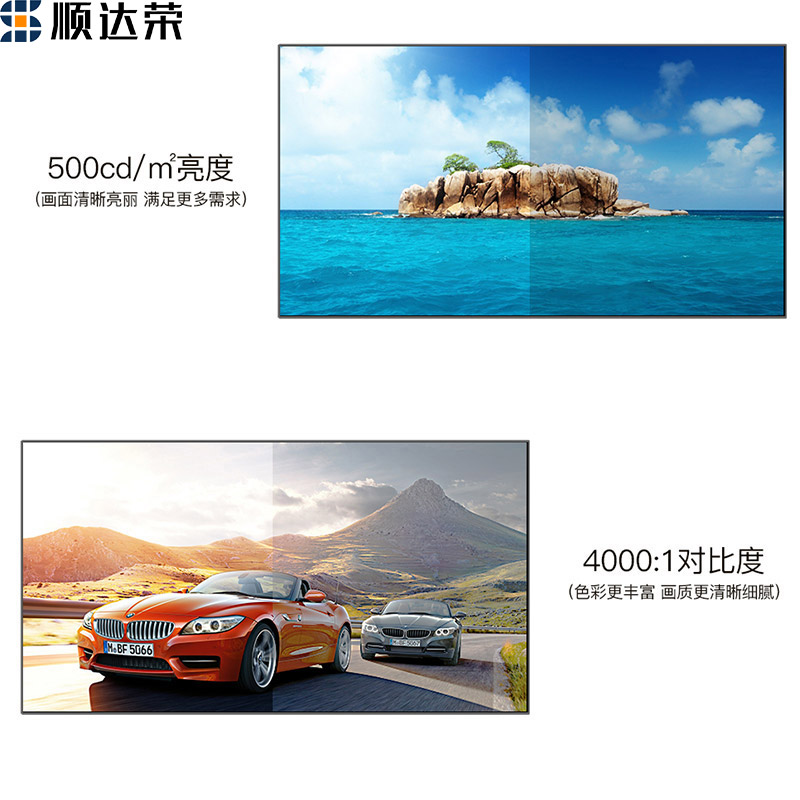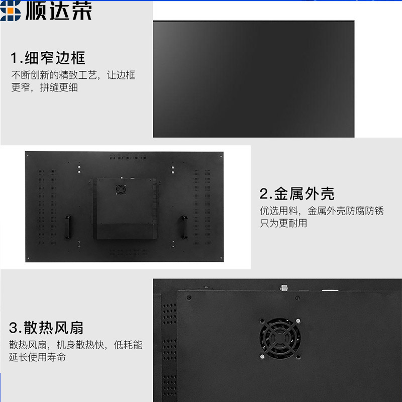 顺达荣46寸无缝拼接屏,画面宏大、色彩艳丽,清晰度高,视觉冲击强烈,具有很好的展示、演示、广告、宣传的效果;安装简便、不受空间限制。46寸无缝液晶拼接墙被广泛应用于:视频监控、交通控制、安防监控以及国防、舞台娱乐、电视演播厅、股票证券、